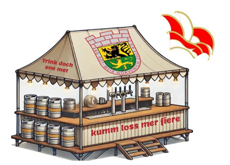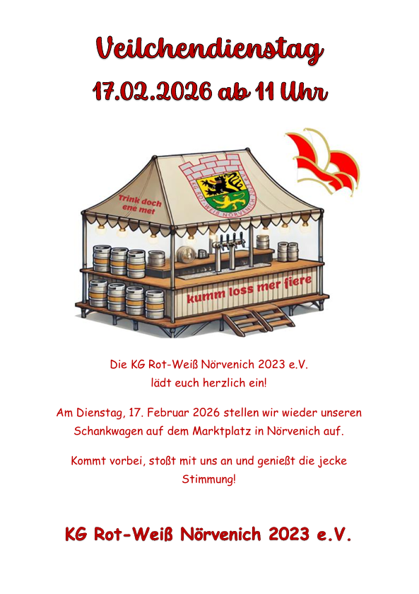 Auch in diesem Jahr stellt die KG Rot-Weiß Nörvenich ihren Schankwagen auf dem Marktplatz in Nörvenich auf. Kommt vorbei, genießt die närrische Stimmung und stoßt mit uns am Veilchendienstag an. Wir freuen uns auf euch!